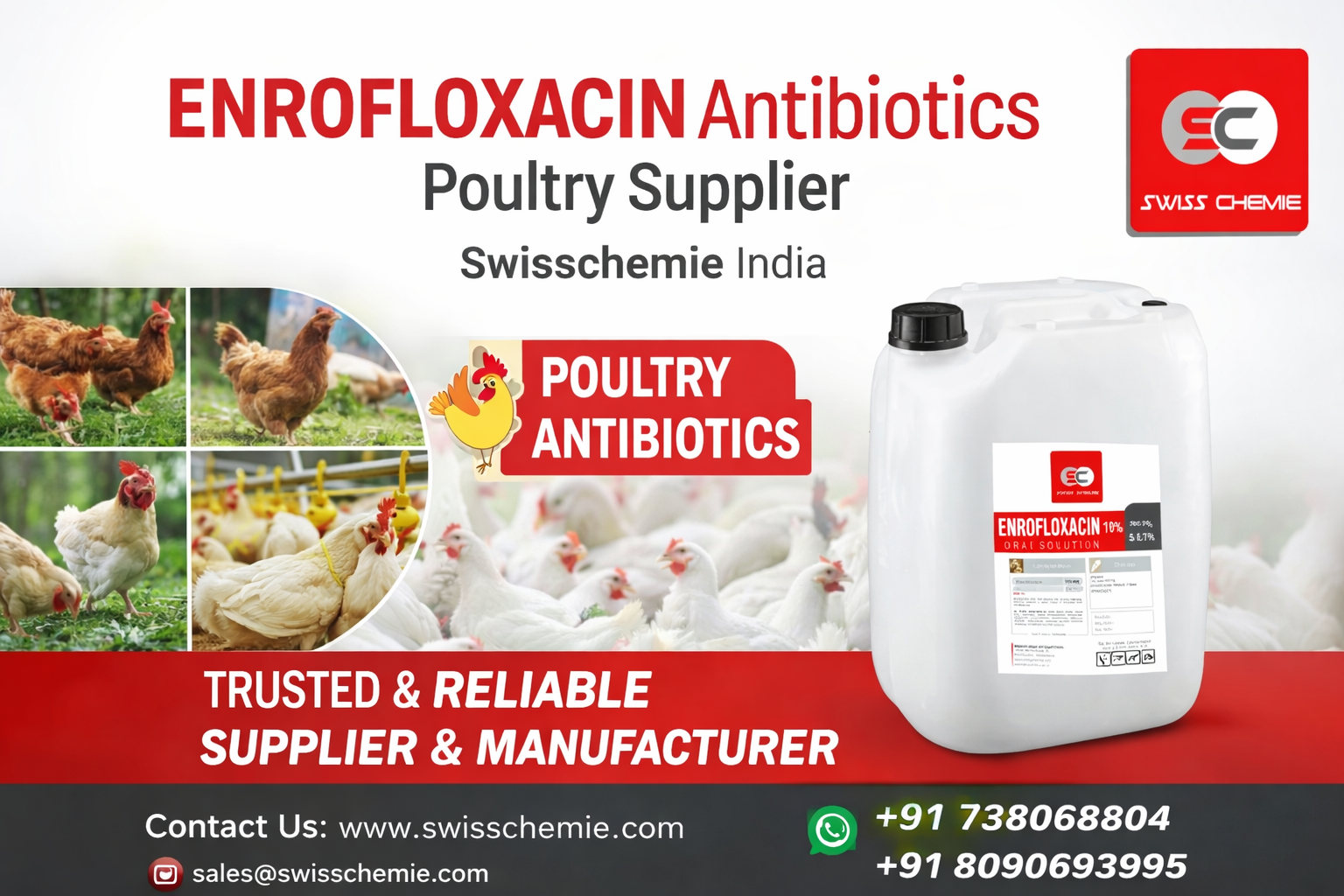 Swisschemie is a trusted ENRofloxacin Antibiotics poultry supplier and reliable manufacturer in India, delivering high-quality ENROFLOXACIN solutions for commercial poultry farms. As a professional ENRofloxacin Antibiotics poultry supplier, Swisschemie ensures strict quality control, stable formulation, and consistent product performance. Poultry farmers across India choose this experienced ENRofloxacin Antibiotics poultry supplier for dependable supply and advanced manufacturing standards.