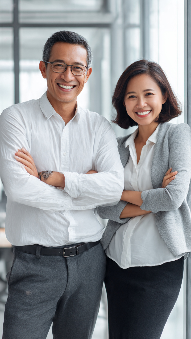 a confident indonesian man and woman aged