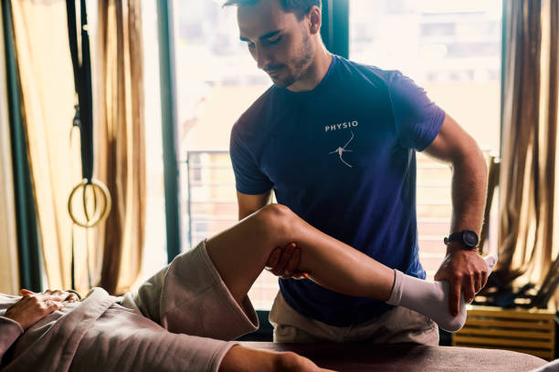 Physiotherapist performing knee examination on patient. Close-up shot in rehabilitation clinic. Heal